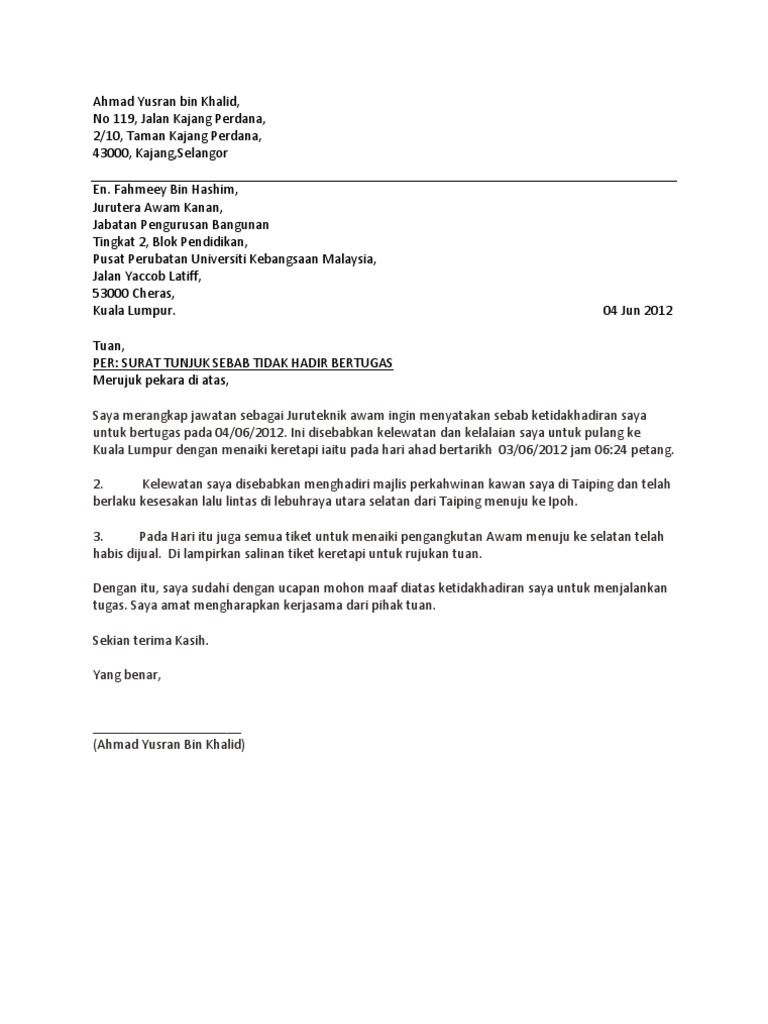 Surat Rasmi Tunjuk Sebab Tidak Hadir Bertugas Letter 7saudara Com